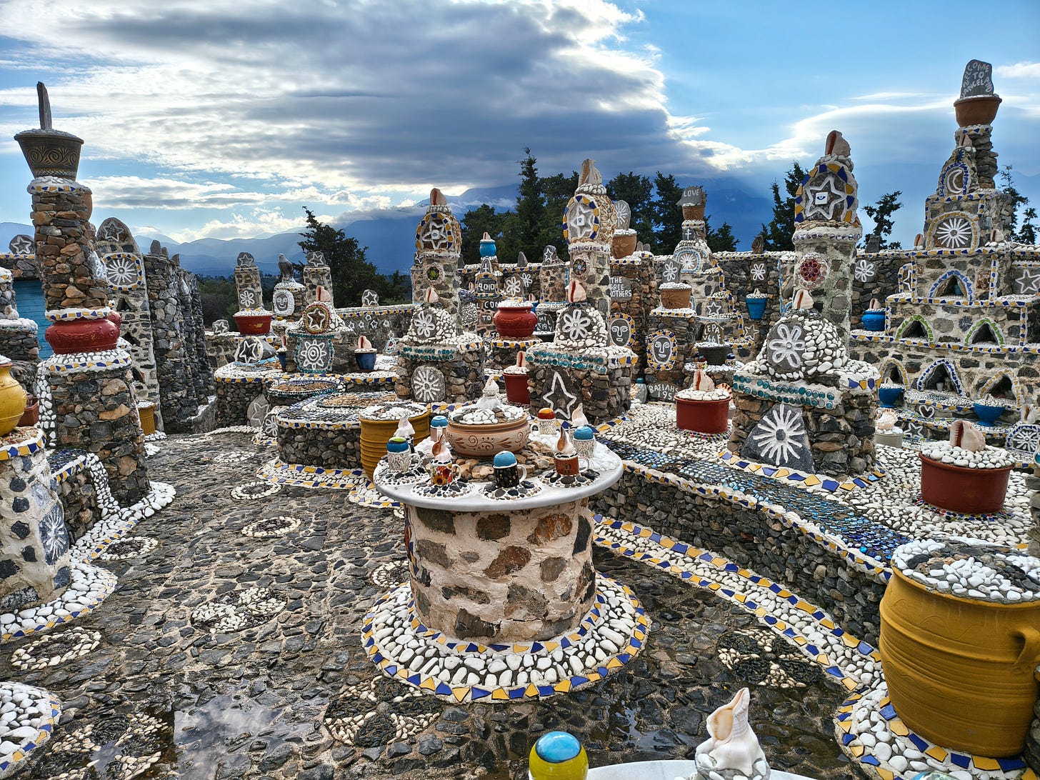 Der „Garten” von Vangelis Vlepakis ist ein verschlungenes Labyrinth. Die Wege sind schmal, manchmal nur breit genug, um einen Fuß vor den anderen zu setzen. Links und rechts Steinskulpturen, sorgfältig gebaut.