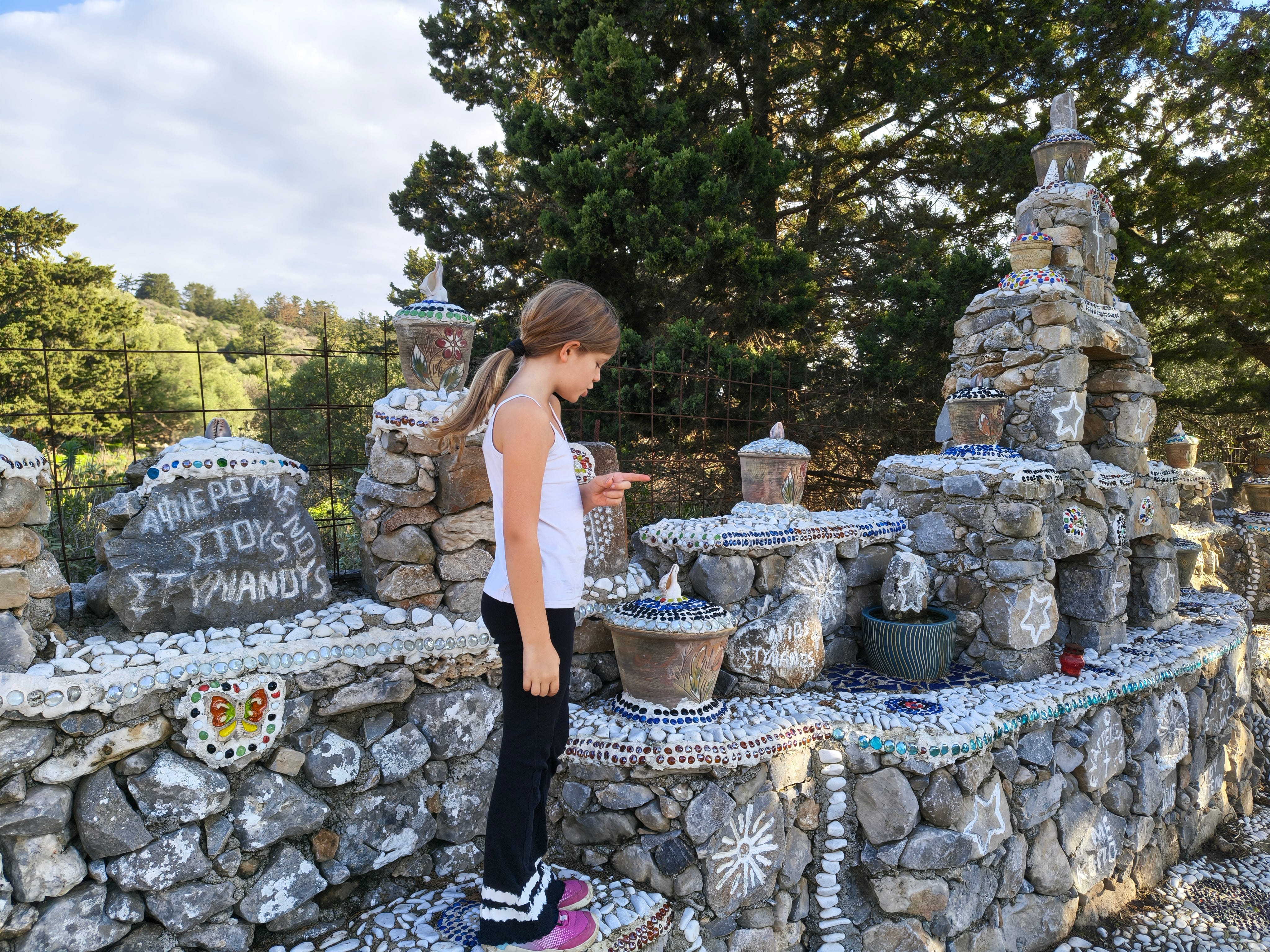 Gebaut hat das Vangelis Vlepakis - ein Mann aus Kefalas, der rund um das Dorf seit Jahren solche Steinsetzungen entstehen lässt: draußen an der Straße, und weiter oben als verwinkelter Steingarten.