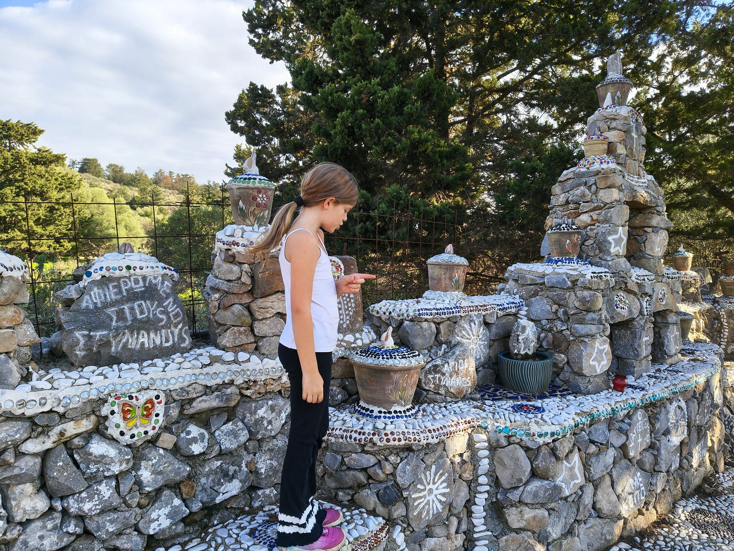 Ich verstand das noch weniger als die Monumente am Straßenrand. Alte Vinylplatten, Ikonen, Porzellanhunde. Steinskulpturen mit eingeritzten Namen, wie ein verspielter Gaudí-Friedhof - und irgendwo ein Blumentopf, in dem Erdbeeren wachsen.