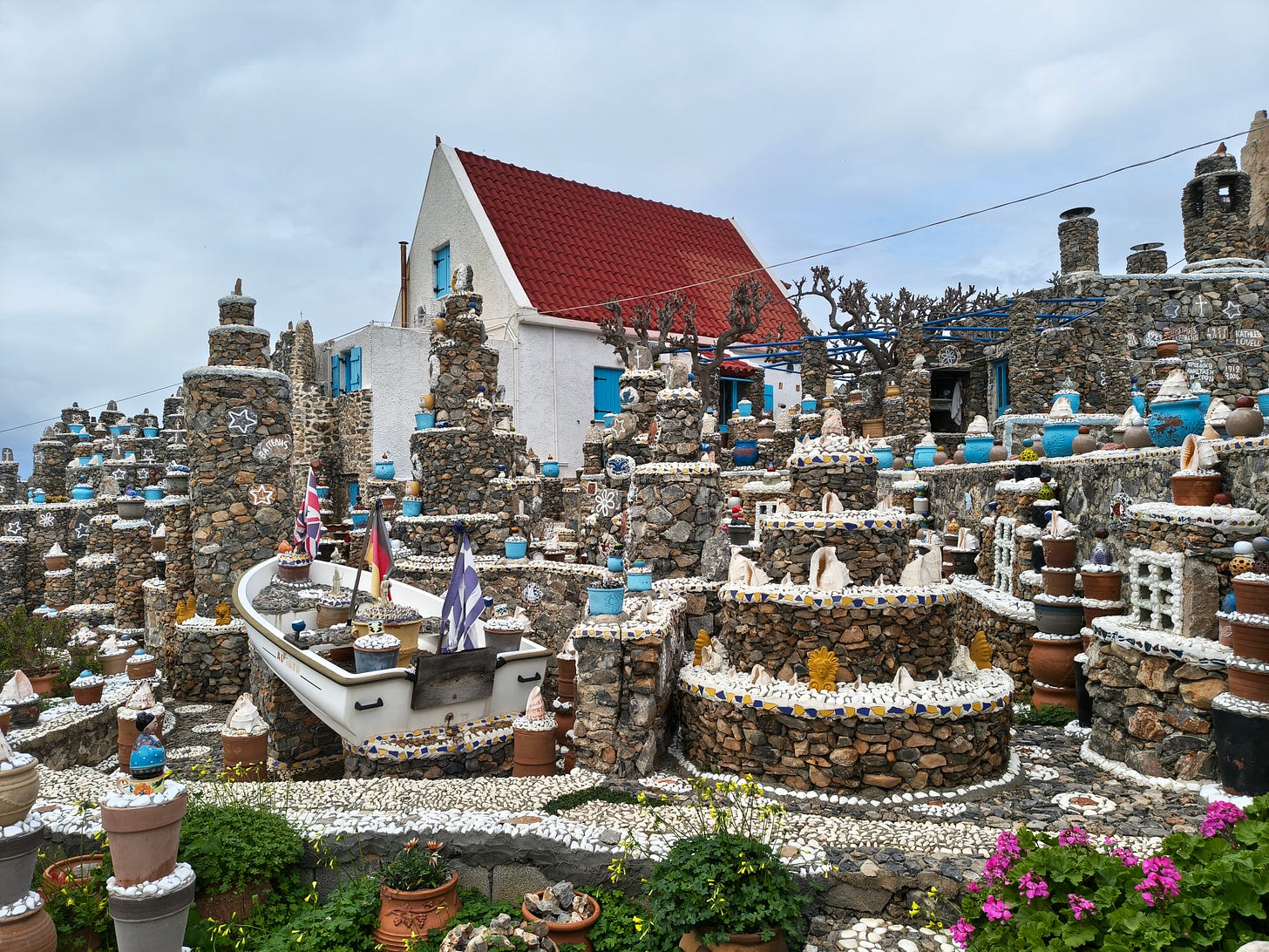 Es ist mit Steinen verziert, wie alles hier. Ein paar bunte Blumetöpfe stehen drin, die wie Urnen aussehen. Drei Flaggen sind gehisst: Griechenland, Deutschland, Großbritannien.